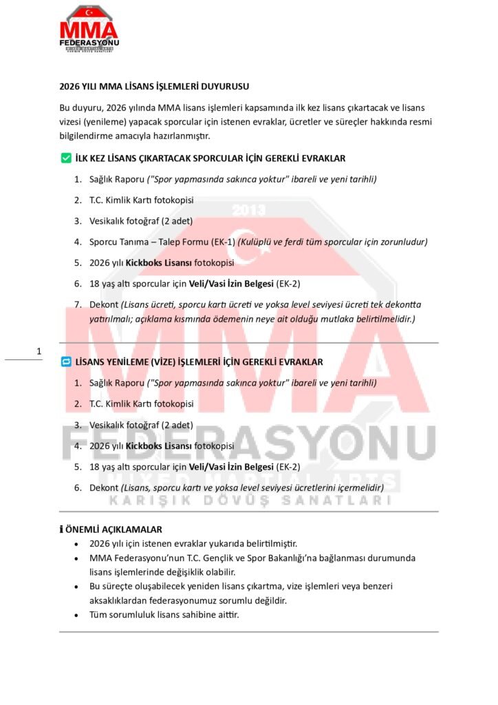 Bu duyuru, 2026 yılında MMA lisans işlemleri kapsamında ilk kez lisans çıkartacak ve lisans vizesi ( Yenileme yapacak sporcular için istenen evraklar, ücretler ve süreçler hakkında bilgilendirme amacıyla hazırlanmıştır.